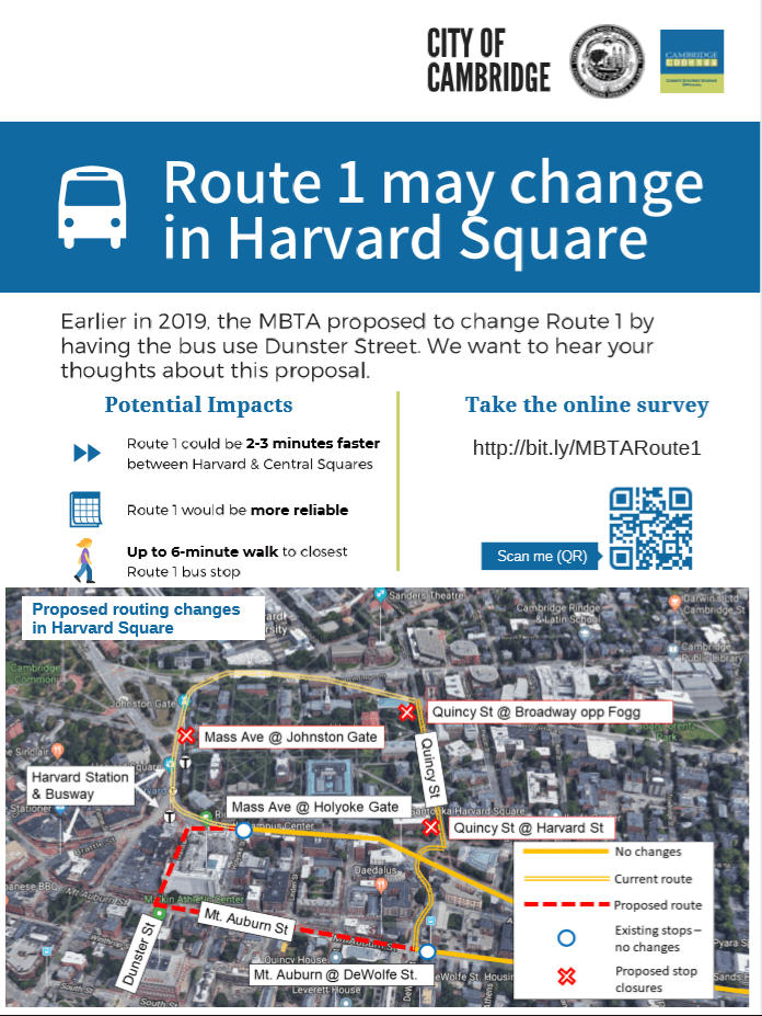 Earlier in 2019, the MBTA proposed to change Route 1 by having the bus use Dunster Street instead of going around Harvard Yard. The City of Cambridge wants to hear the public’s thoughts on the proposal. Take our online survey at http://bit.ly/MBTARoute1 to tell us what you think. With this change, the MBTA thinks that the Route 1 could be 2 to 3 minutes faster between Harvard and Central Squares and more reliable. For bus stops that would be closed because of this proposal, it could take up to 6 minute to walk to the closest bus stop serving a rerouted Route 1. Below you will find a diagram showing the MBTA’s proposed changes to Route 1.